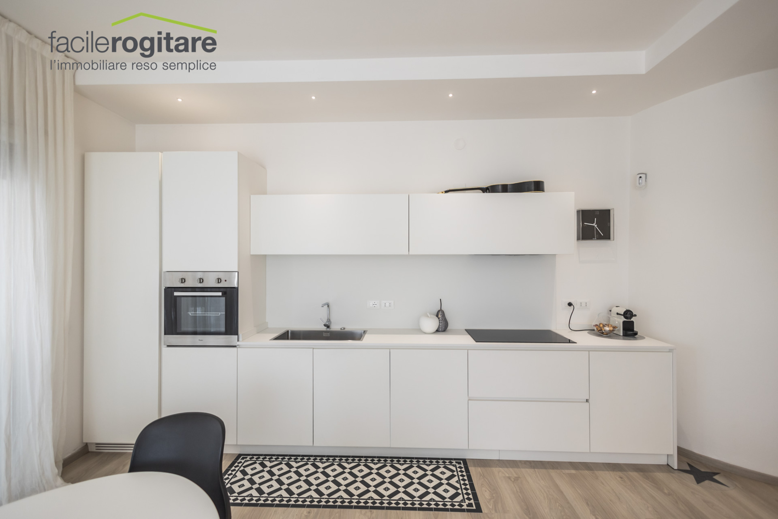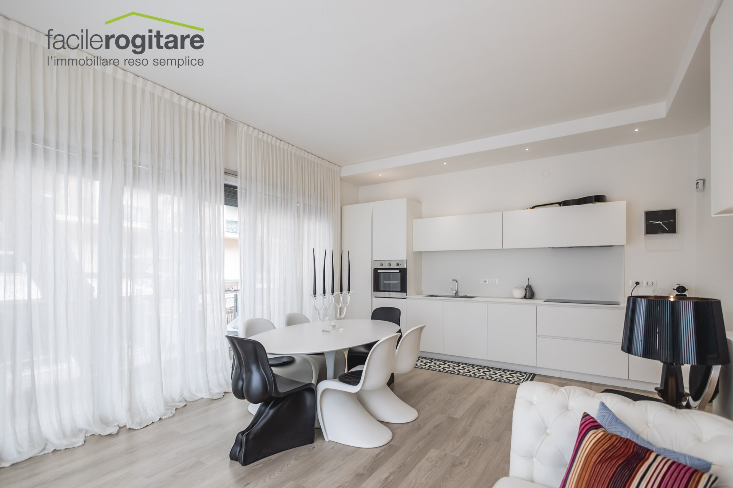 L’ingresso conduce ad un soggiorno ampio e luminosissimo, dove la luce filtra da due splendide vetrate a tutta altezza. La zona giorno è il vero protagonista della casa: moderna e con una cucina di design a vista, perfettamente integrata nel living.