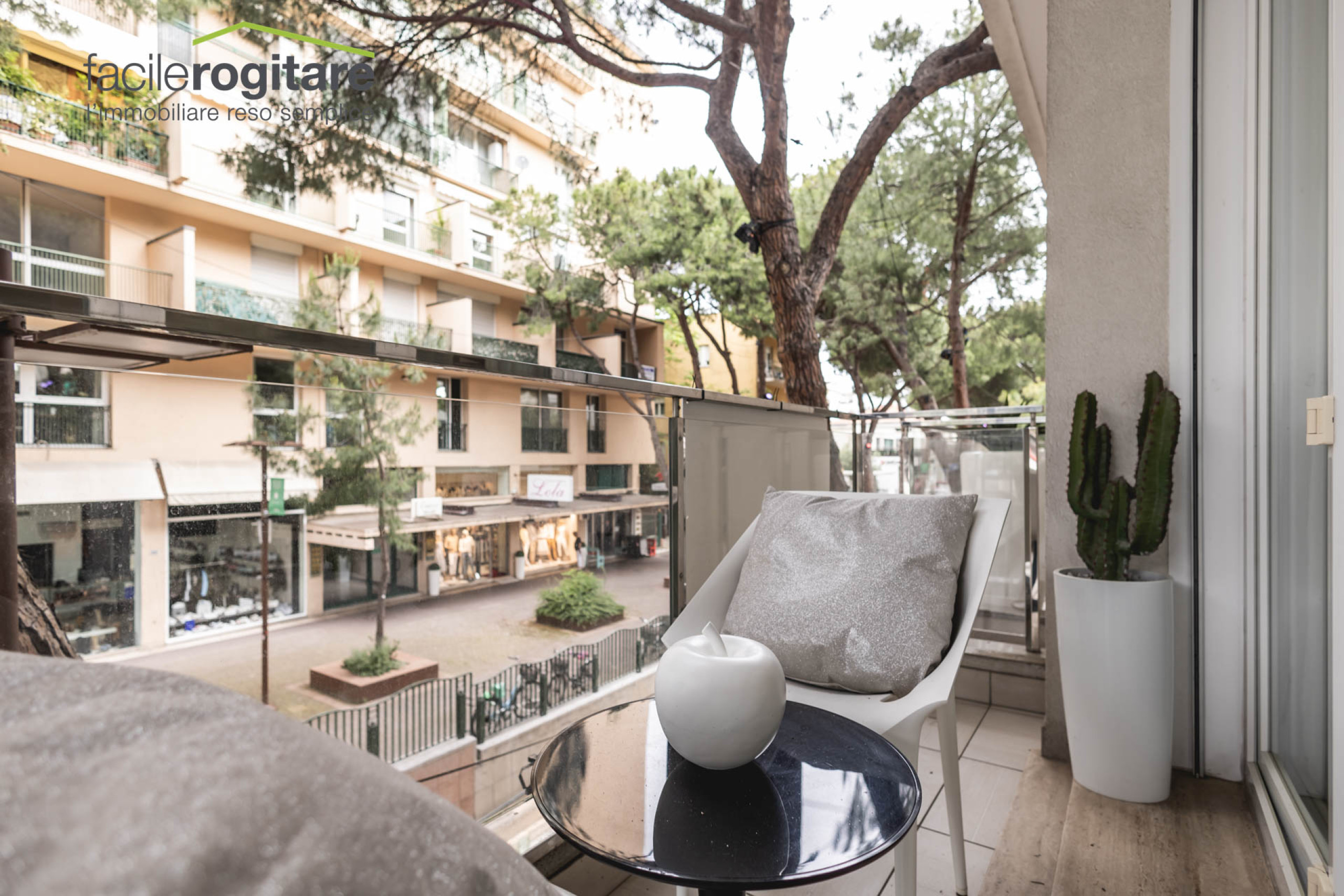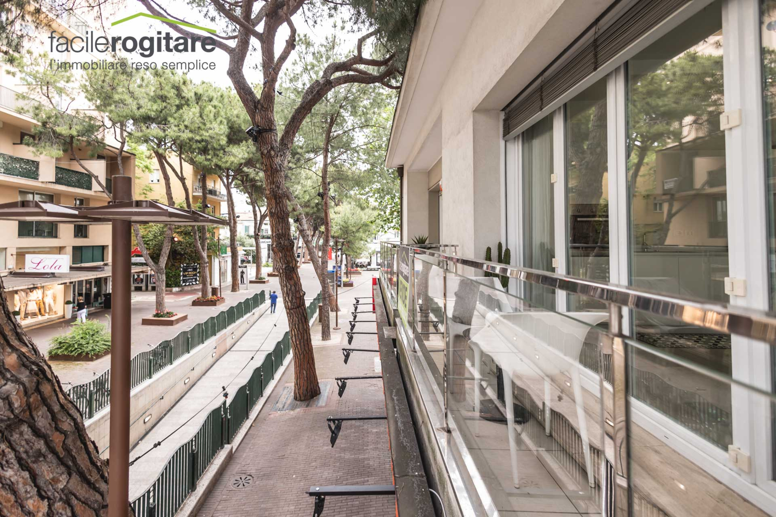 La grande vetrata si apre completamente su un terrazzino affacciato direttamente sul Viale Ceccarini, dove potrai vivere ogni stagione tra i colori, i profumi e l’energia di Riccione.