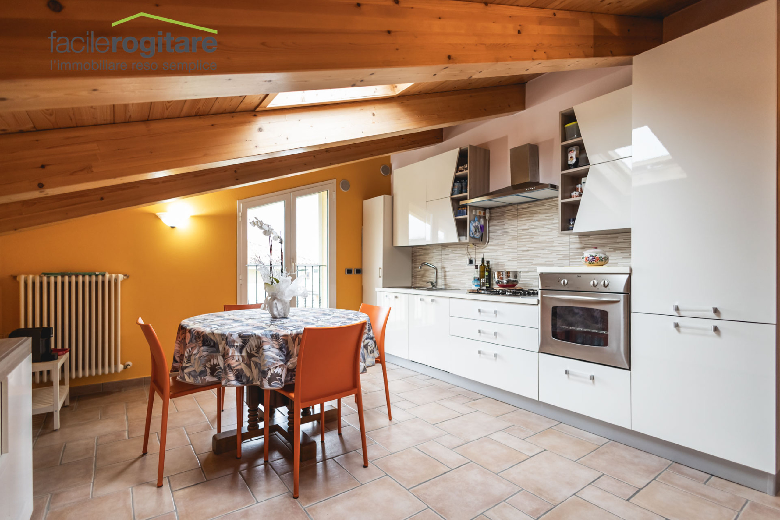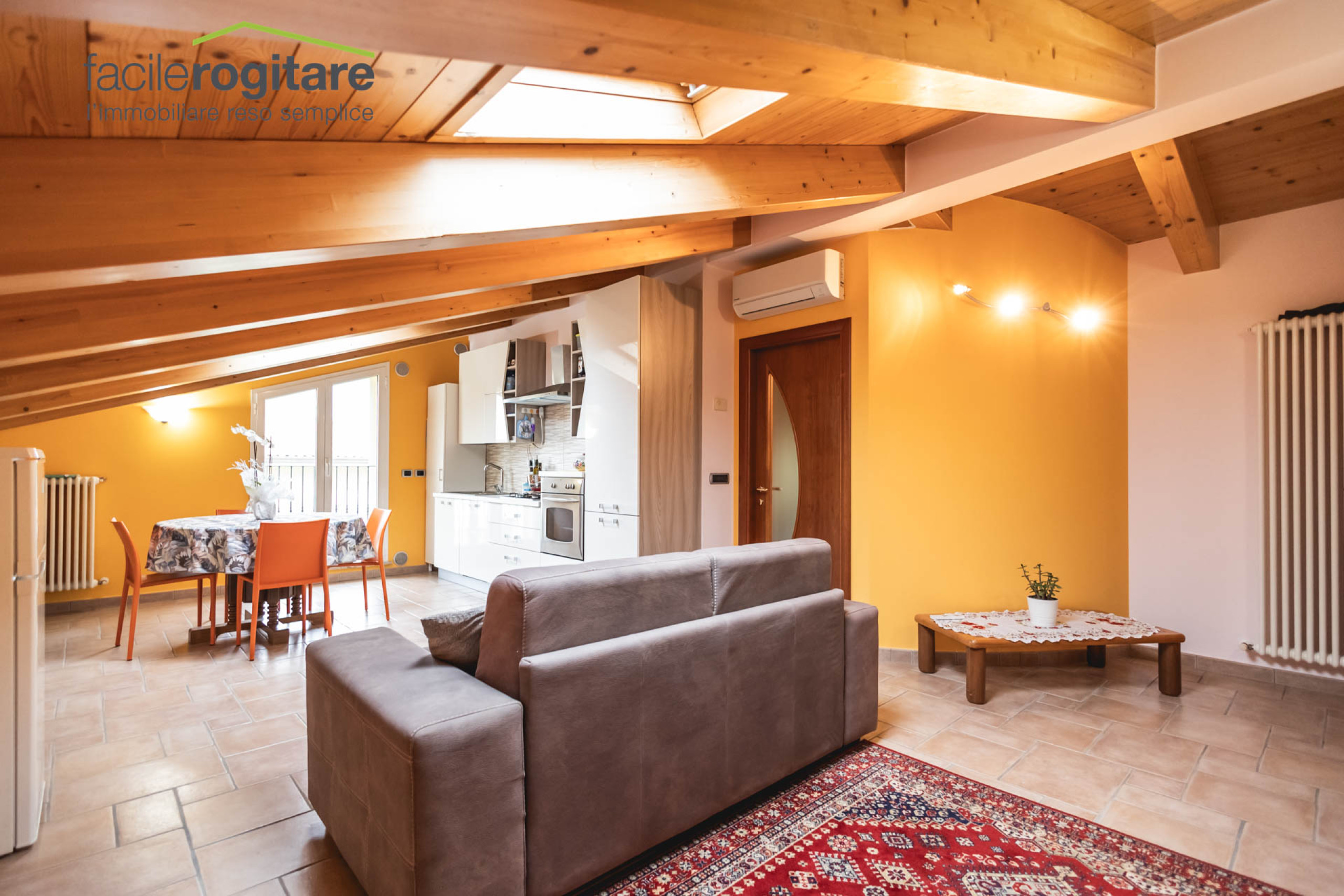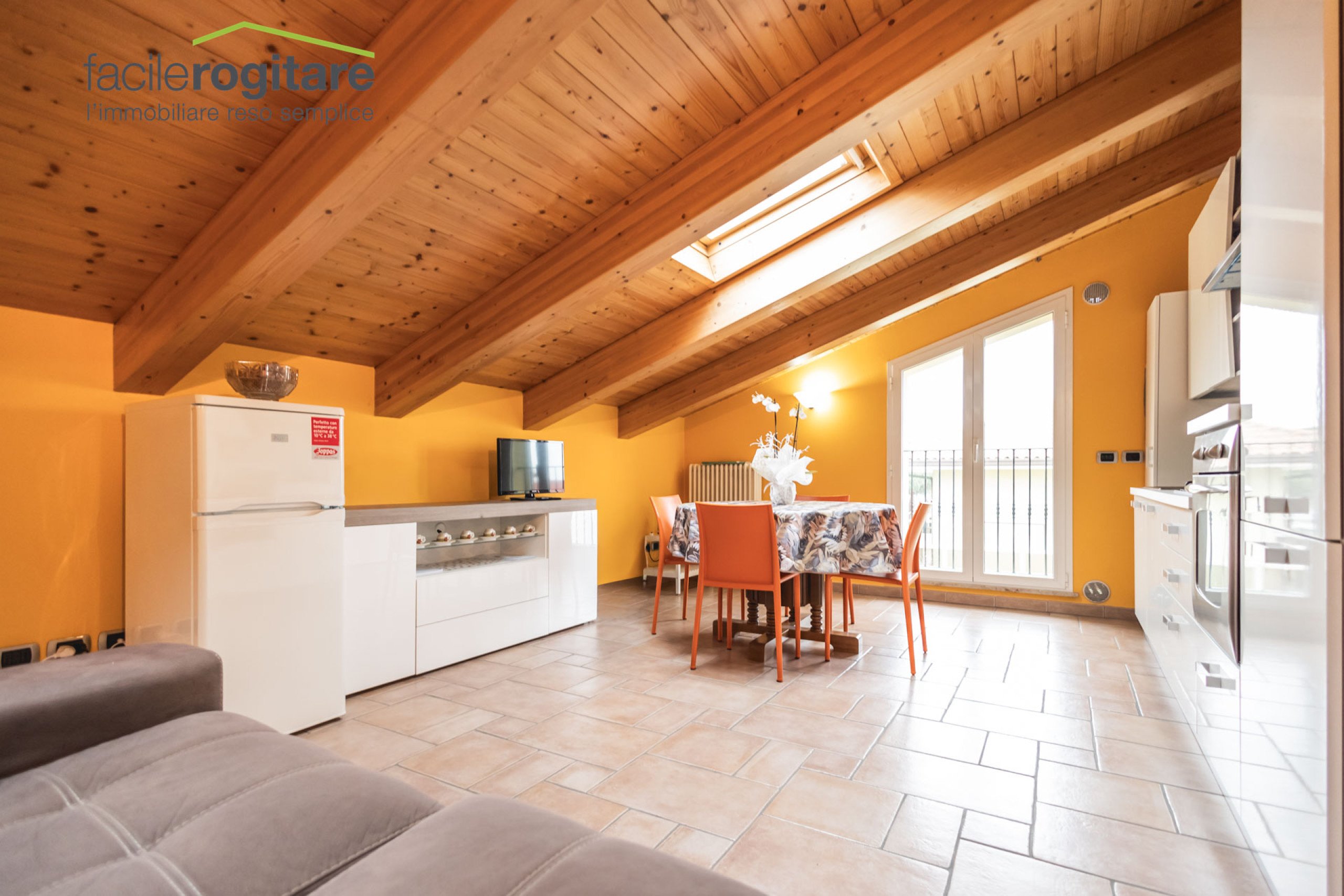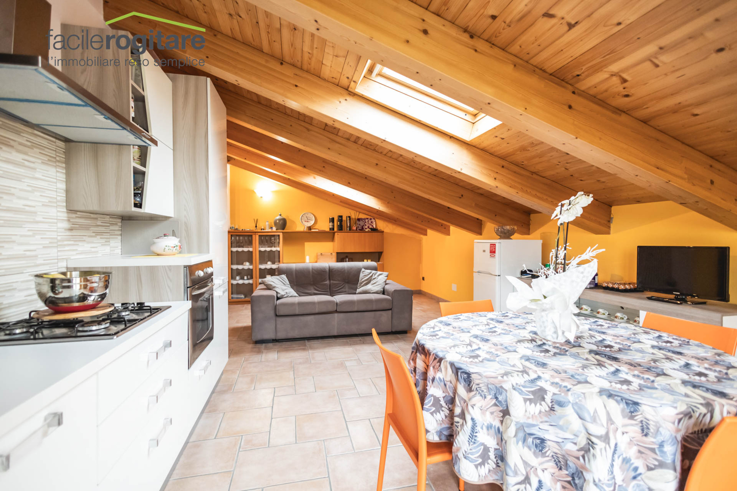 Appena varcata la soglia, l’ampio soggiorno ci accoglie con un ampio spazio ben illuminato. La zona pranzo, unita strategicamente al cucinotto, crea un unico ambiente conviviale: una cucina abitabile dove i profumi e le chiacchiere si intrecciano in ogni momento della giornata.