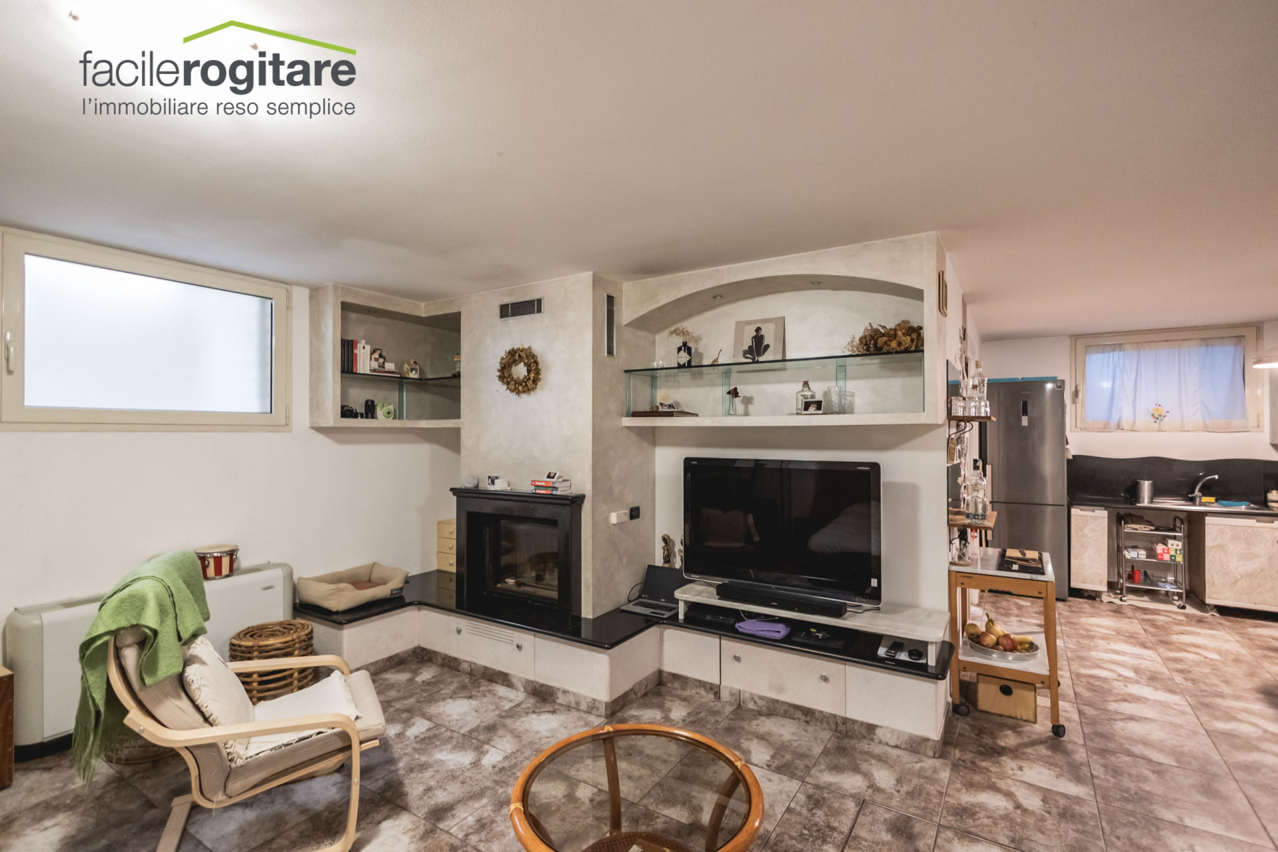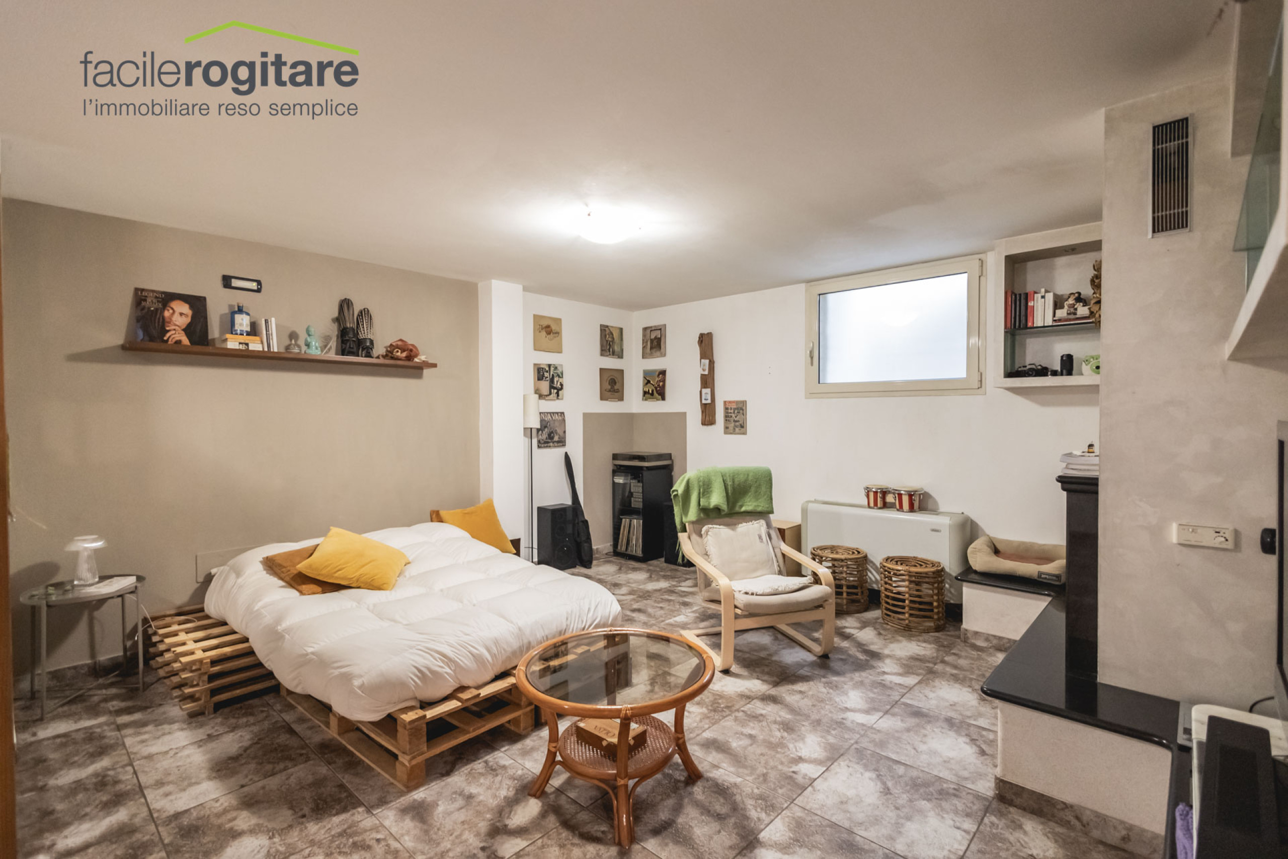 Il piano seminterrato sorprende per dimensioni e luminosità, grazie alle numerose bocche di lupo: qui troviamo una tavernetta con soggiorno e cucina a vista, un bagno e due locali versatili, oggi utilizzati come camere ma facilmente adattabili a lavanderia, studio o spazi hobby.